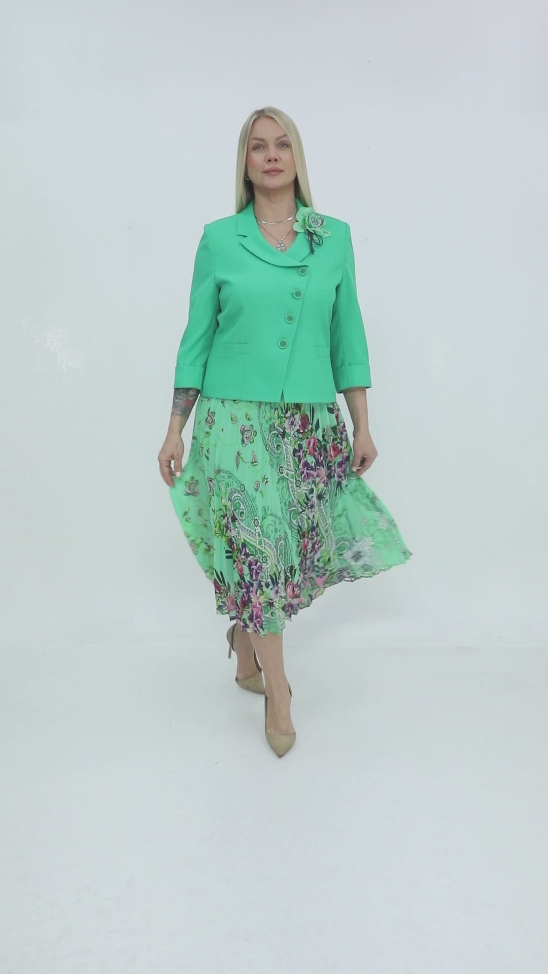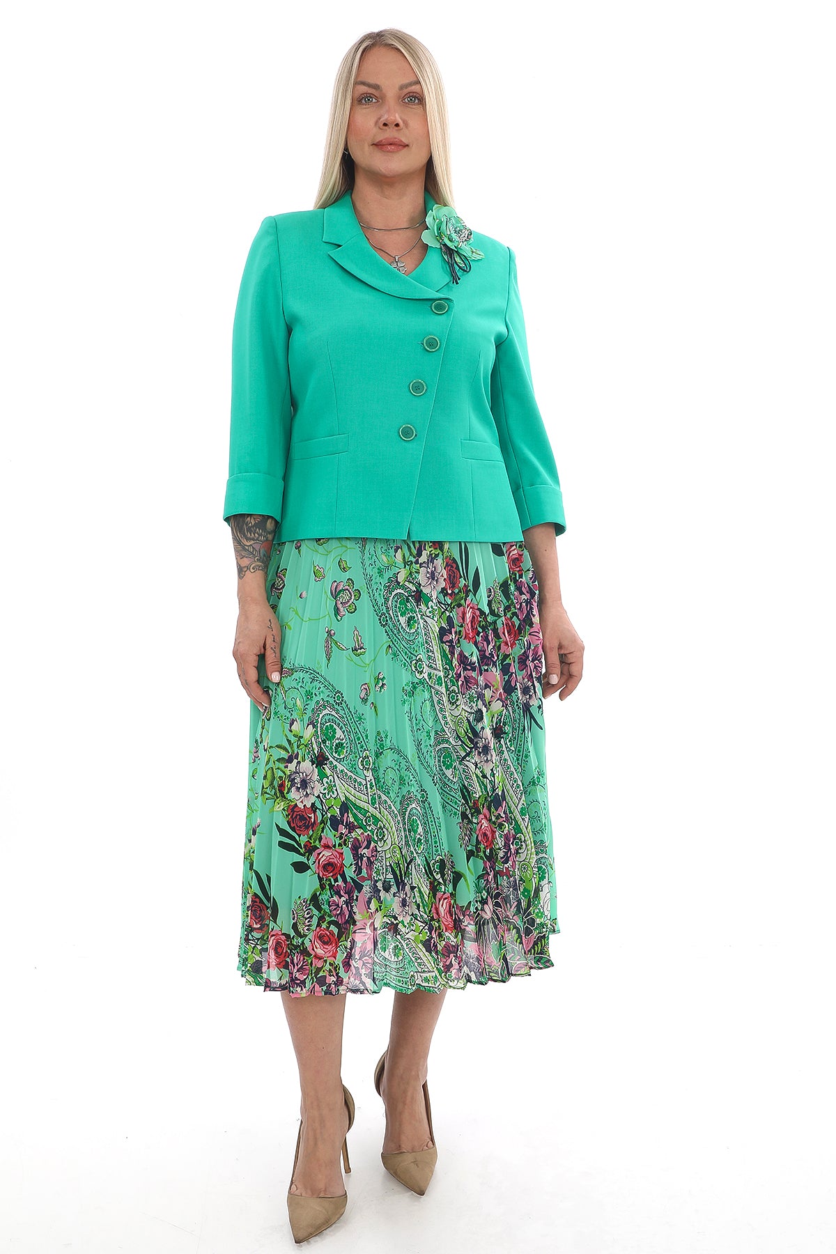 Canlı yeşil ceket ve çiçek desenli elbiseden oluşan bu takım, bahar ve yaz sezonunun en dikkat çekici parçalarındandır. Zarif ve feminen bir görünüm sunar.